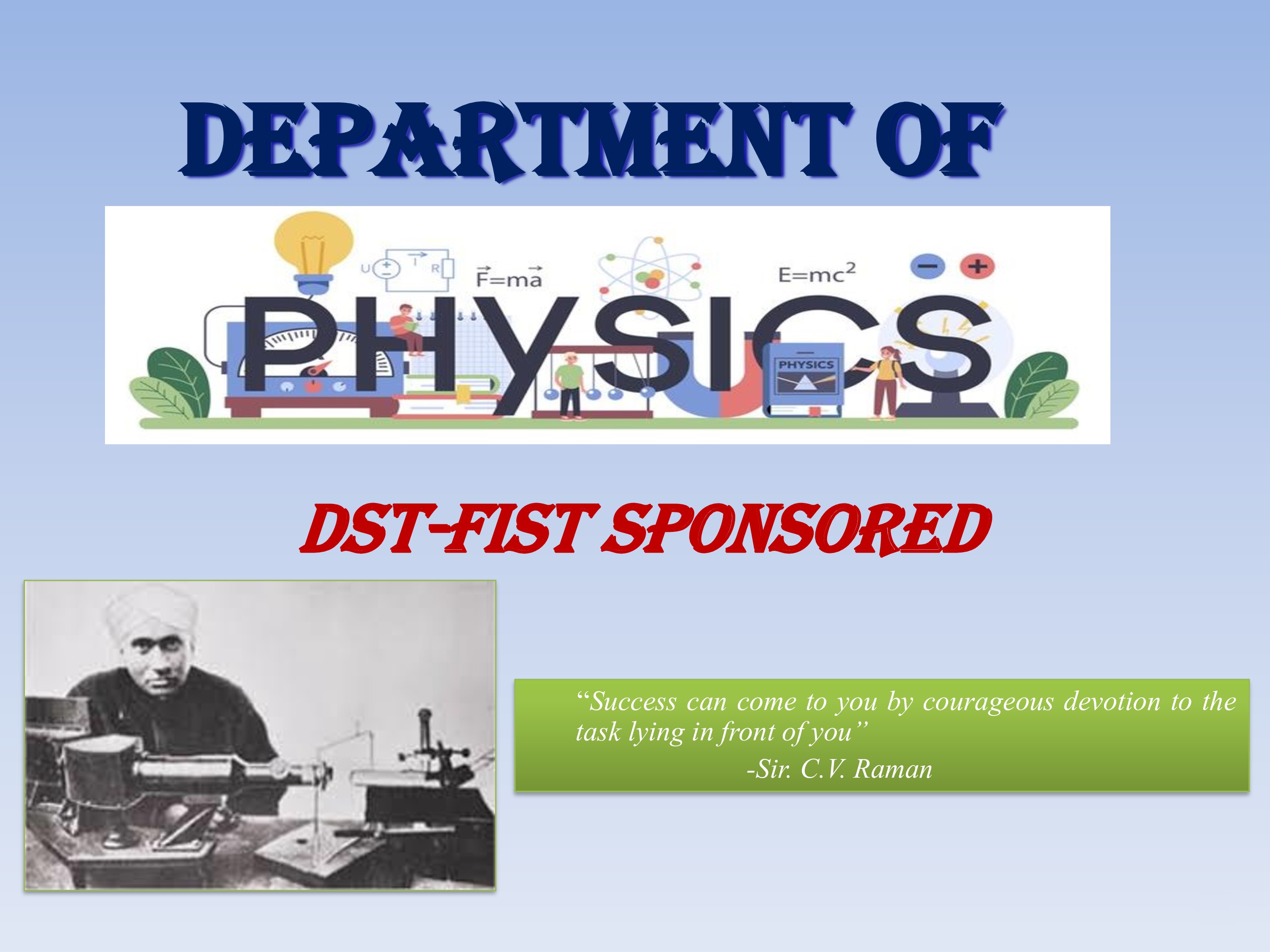 The Department of Physics has been recognized as a beneficiary of the Fund for the Improvement of Science and Technology (FIST) sponsored by the of Science and Technology, Govt. of India, New Delhi, since 2022, with the financial assistant of Rs.1.15 Cr and DST-CURIE (Consolidation of University Research for Innovation and Excellence) program, in the year 2010.”